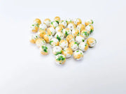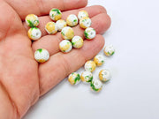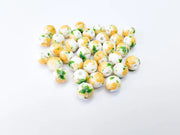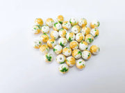 These 10mm round porcelain beads are beautifully decorated with yellow floral and green leaf designs on a glossy white base. Perfect for adding a bright and cheerful touch to your handmade jewelry. Suitable for use in necklaces, bracelets, earrings, and various craft projects.