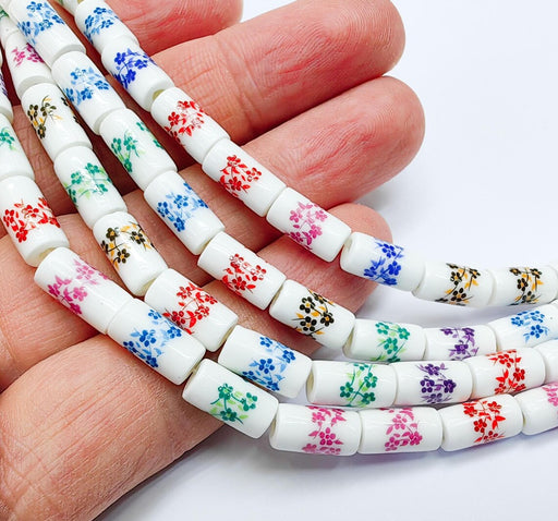 View full details30 Floral Cylinder Porcelain Ceramic Bead Strand, 30 Pcs Full Strand, White Beads with Colorful Flower Print, 11x6mm Glossy Bead G37026