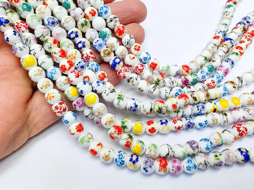 View full details35 Floral Round Porcelain Ceramic Bead Strand, 35 Pcs Full Strand, White Beads with Colorful Flower Print, 10mm Glossy Jewelry Bead G37055