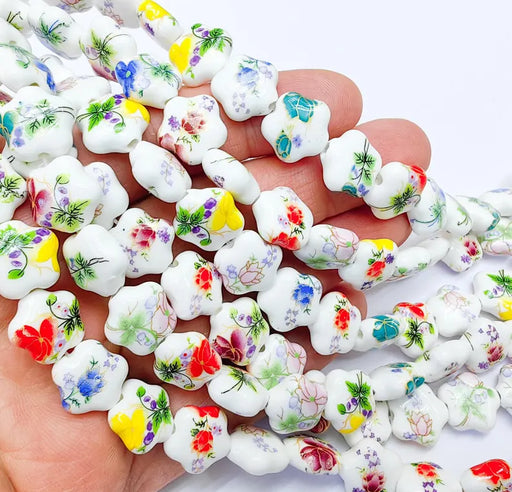 View full details25 Floral Flower Porcelain Ceramic Bead Strand, 25 Pcs Full Strand, White Beads with Colorful Flower Print, 14x13mm Glossy Jewelry G37023