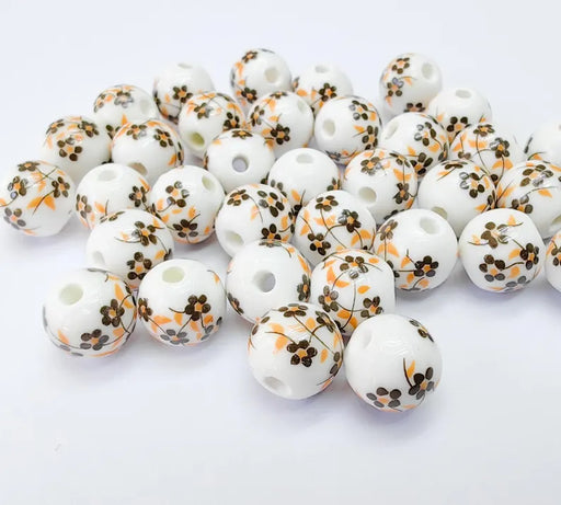 View full detailsRound Porcelain Beads, White Ceramic Beads with Mustard Floral Print, Brown Flowers, Glossy Finish, DIY Jewelry Making 10mm G37039