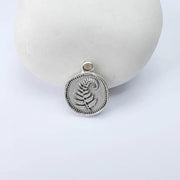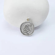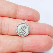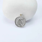 Antique silver plated fern leaf charm featuring a delicate botanical design on both sides. This small round pendant showcases a detailed fern frond with a softly textured background and decorative beaded border, symbolizing growth, resilience, and new beginnings. Perfect for creating necklaces, bracelets, earrings, and nature-inspired handmade jewelry designs.