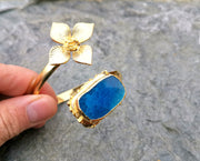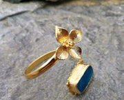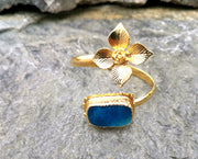 Flower Bracelet with Blue Agate Gemstone Gold Plated Brass Adjustable SR56