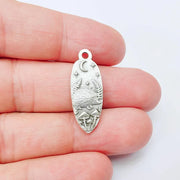 Antique Silver hedgehog charm featuring a detailed double sided woodland design with crescent moon, stars, mushrooms, and botanical elements. This oval-shaped pendant reflects a peaceful night forest scene, perfect for creating unique and nature-inspired jewelry pieces.
