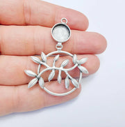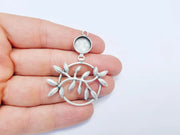 This antique silver-plated pendant features an elegant olive branch design encased in a circular frame, symbolizing peace and harmony. The pendant includes a bezel setting at the top, perfect for adding a cabochon, resin, or gemstone for personalization. Ideal for creating necklaces, earrings, or decorative charms, this unique component adds a touch of nature-inspired artistry to your handmade jewelry. Crafted from high-quality materials, it ensures durability and a lasting finish, making it an excellent choice for both casual and formal designs.