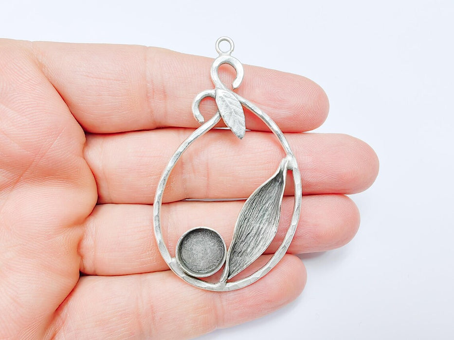 Leaf Pendant Bezel, Cabochon Blank, Locket Pendant Base, inlay Mounting, Resin Necklace, Antique Silver Plated Brass 12mm G36794
