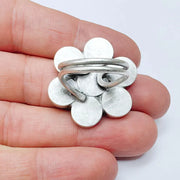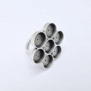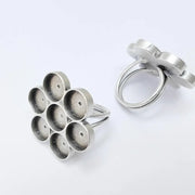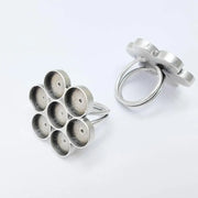 This adjustable ring features seven 10mm round bezels arranged in a floral cluster design, offering a bold and creative base for resin, gemstones, polymer clay, and round cabochon projects. Made entirely from brass, it provides durability and a refined handcrafted look.