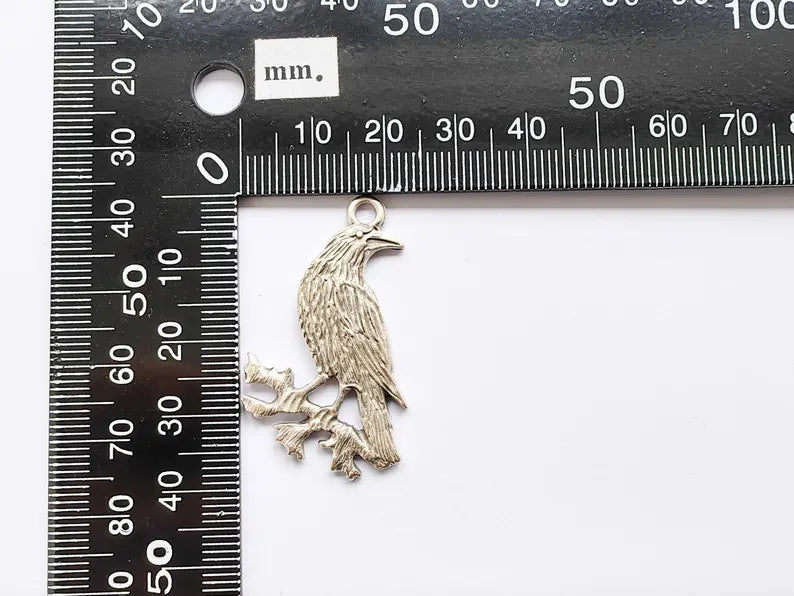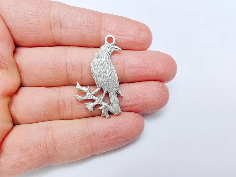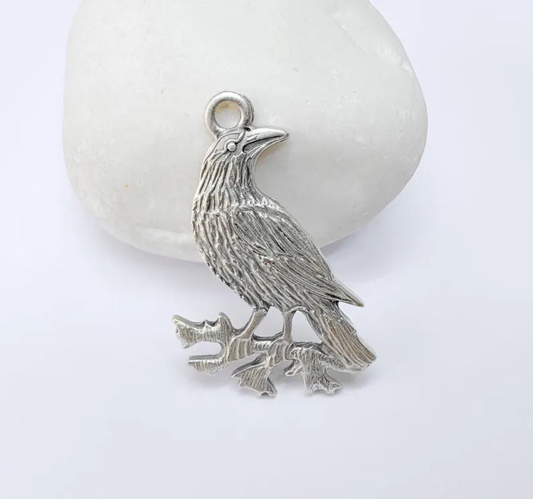 Raven Charm Pendant, Gothic Boho Charm, Nature Earring Charm, Mystical Bird, Necklace Parts, Antique Silver Plated 39x25mm G37008