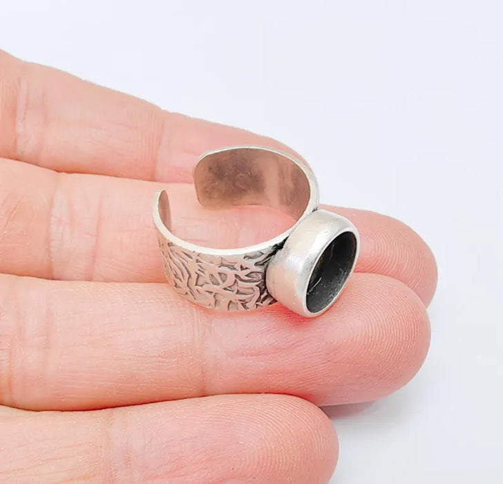 This adjustable ring base features a detailed textured band and a 8 mm round bezel cup, ideal for creating custom rings with resin, cabochons, stones, or glass. With its open back design, it fits a variety of finger sizes and offers a unique handcrafted look for your next jewelry project.