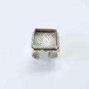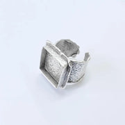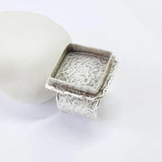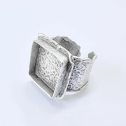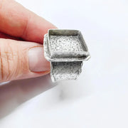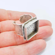 This adjustable ring base features a bold square bezel paired with a wide textured band, creating a strong and artistic statement design. The structured bezel frame combined with the organic textured surface makes it an ideal base for eye-catching handmade ring creations using cabochon, resin, glass, mosaic, or stone elements.